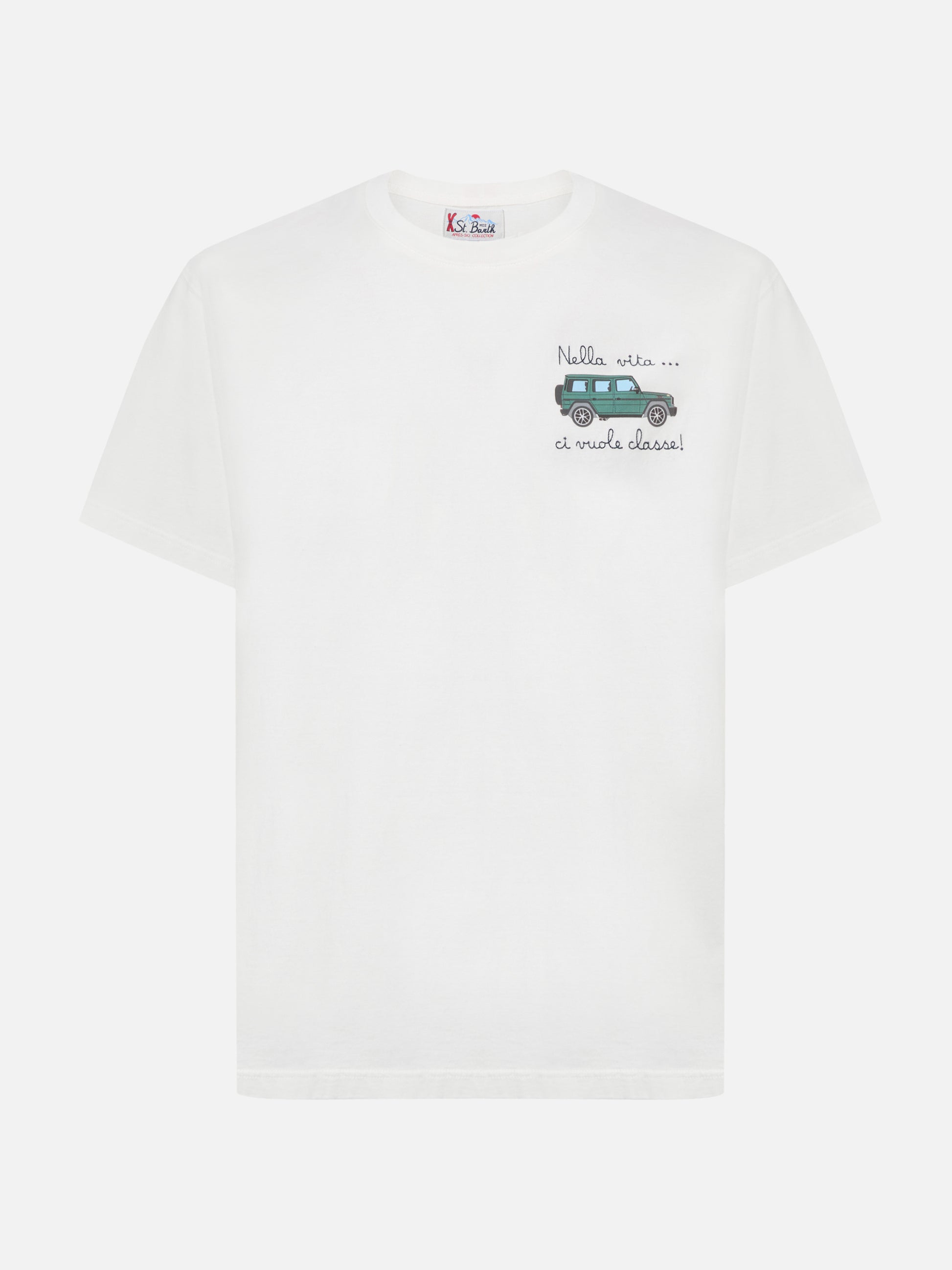 Arnott cotton T-shirt in white with car and Nella vita ci vuole classe embroidery