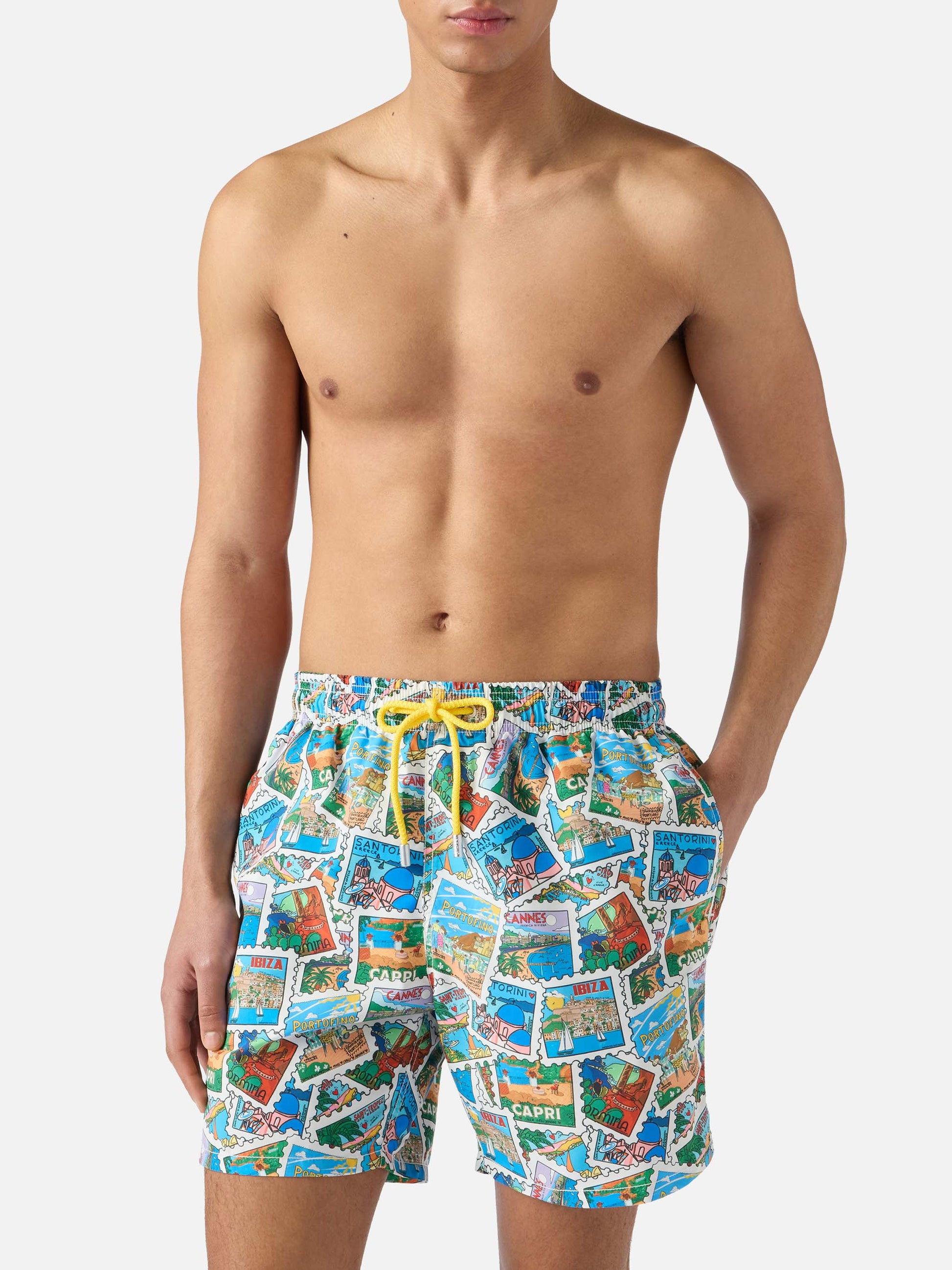 Gustavia swim shorts are crafted from lightweight fabric with a soft peach-touch finish that ensures comfort and a pleasant feel on the skin. The multicolour all-over postcard print gives the style a lively character inspired by travel imagery. The elasticated waistband with drawstring allows the fit to be easily adjusted, while the construction with side pockets, back pocket and stretch antibacterial inner mesh ensures practicality and comfort during wear.