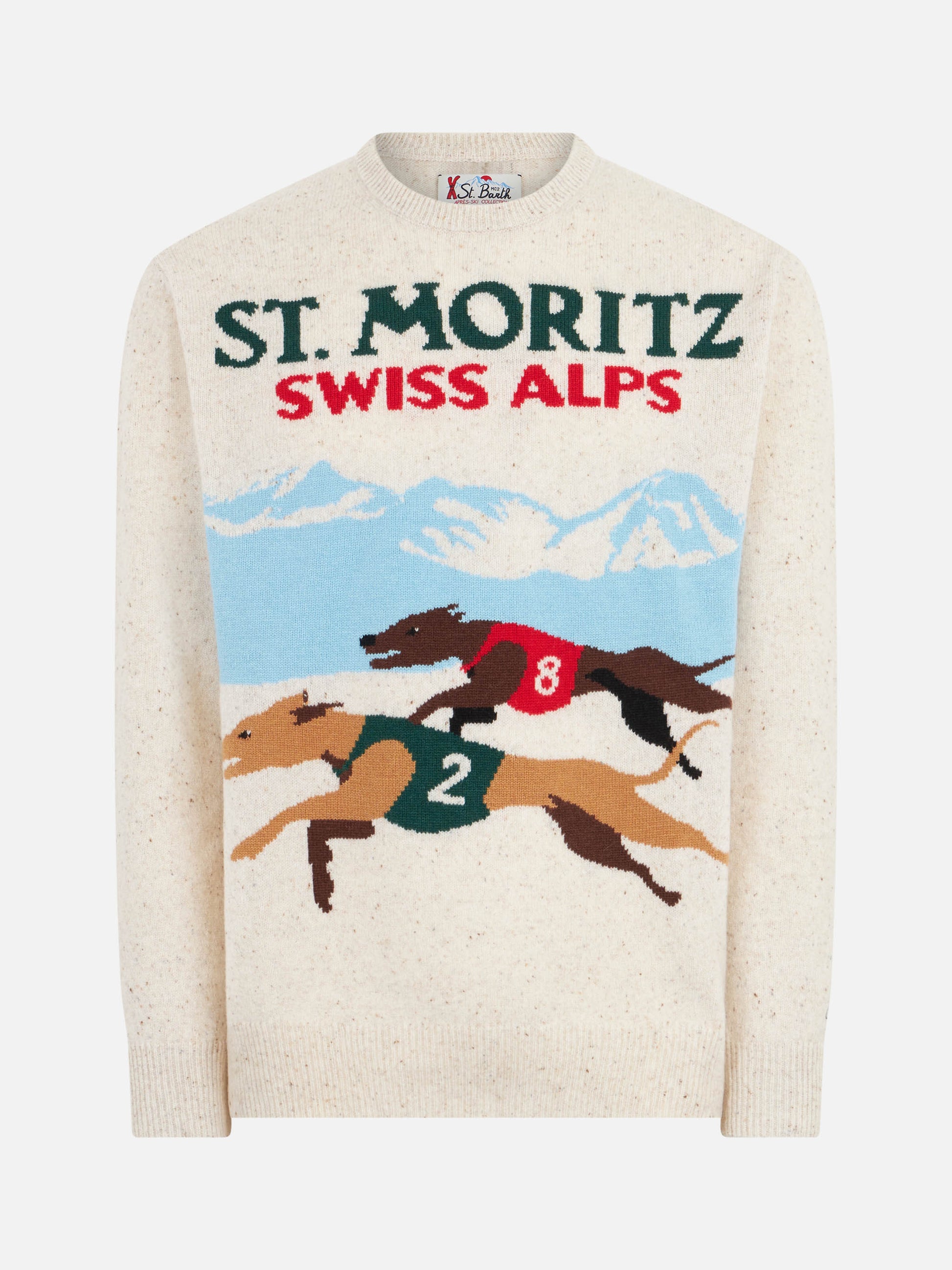 Herren-Donegal-Pullover mit Rundhalsausschnitt und St. Moritz-Polo-Print