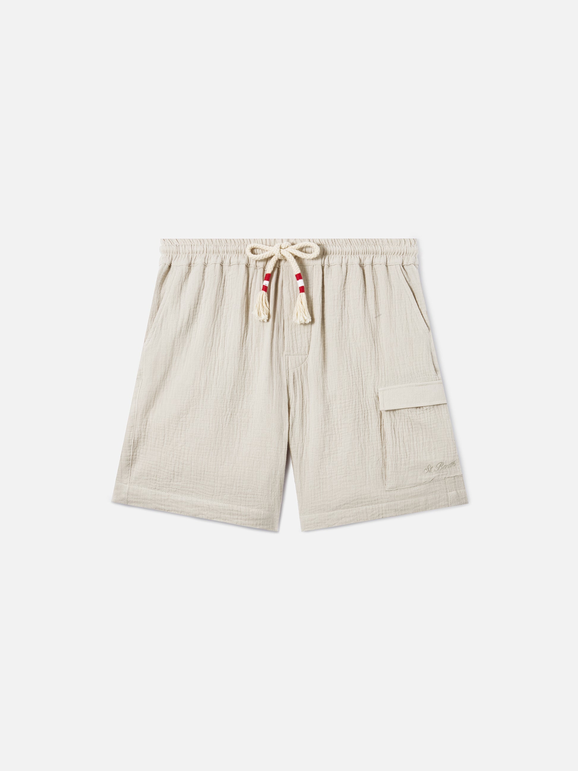 The Marseille bermuda shorts are crafted from crinkled pure cotton gauze, a lightweight and breathable fabric designed to provide comfort and ease. The soft beige solid color design enhances the clean aesthetic of the style. The elasticated waistband with braided rope drawstring with white-red binding allows easy adjustment of the fit. The style is completed with front slanted pockets, back flap pockets with button and a side patch pocket on the left leg. A tone-on-tone St. Barth embroidery on the side pocket adds a distinctive detail. The style features a regular leg, mid-rise waist and relaxed fit.