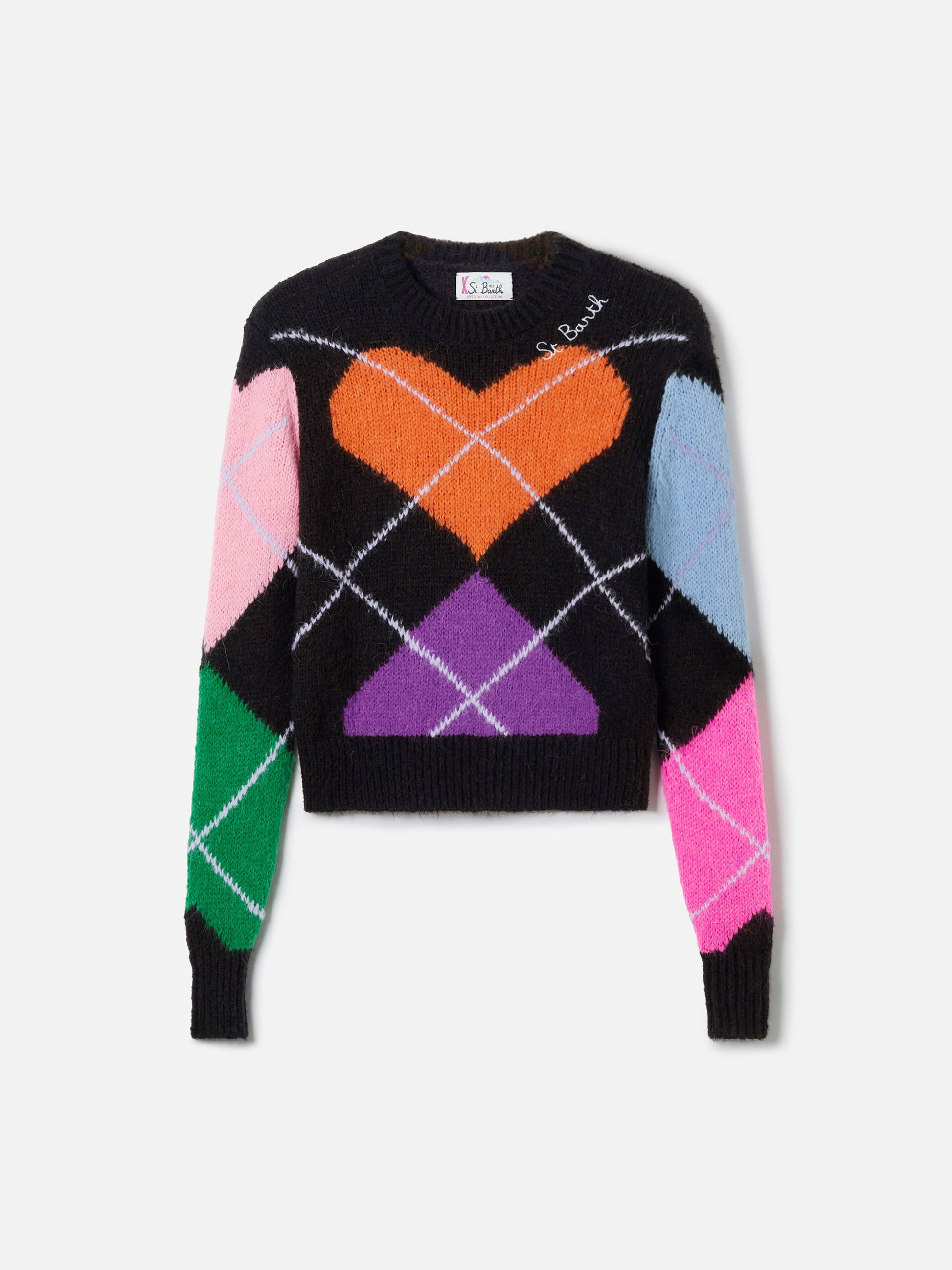 New Queen crewneck crop sweater with multicolor heart intarsia and soft alpaca-blend yarn.