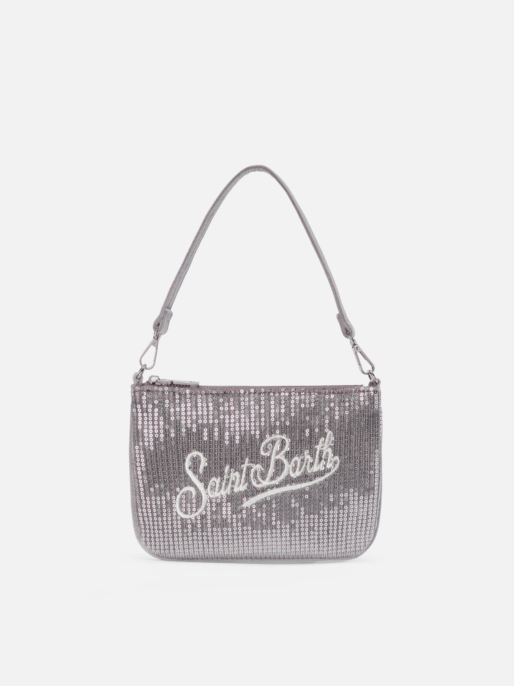 Parisienne Mini-Schultertasche aus grauem Samt mit Pailletten