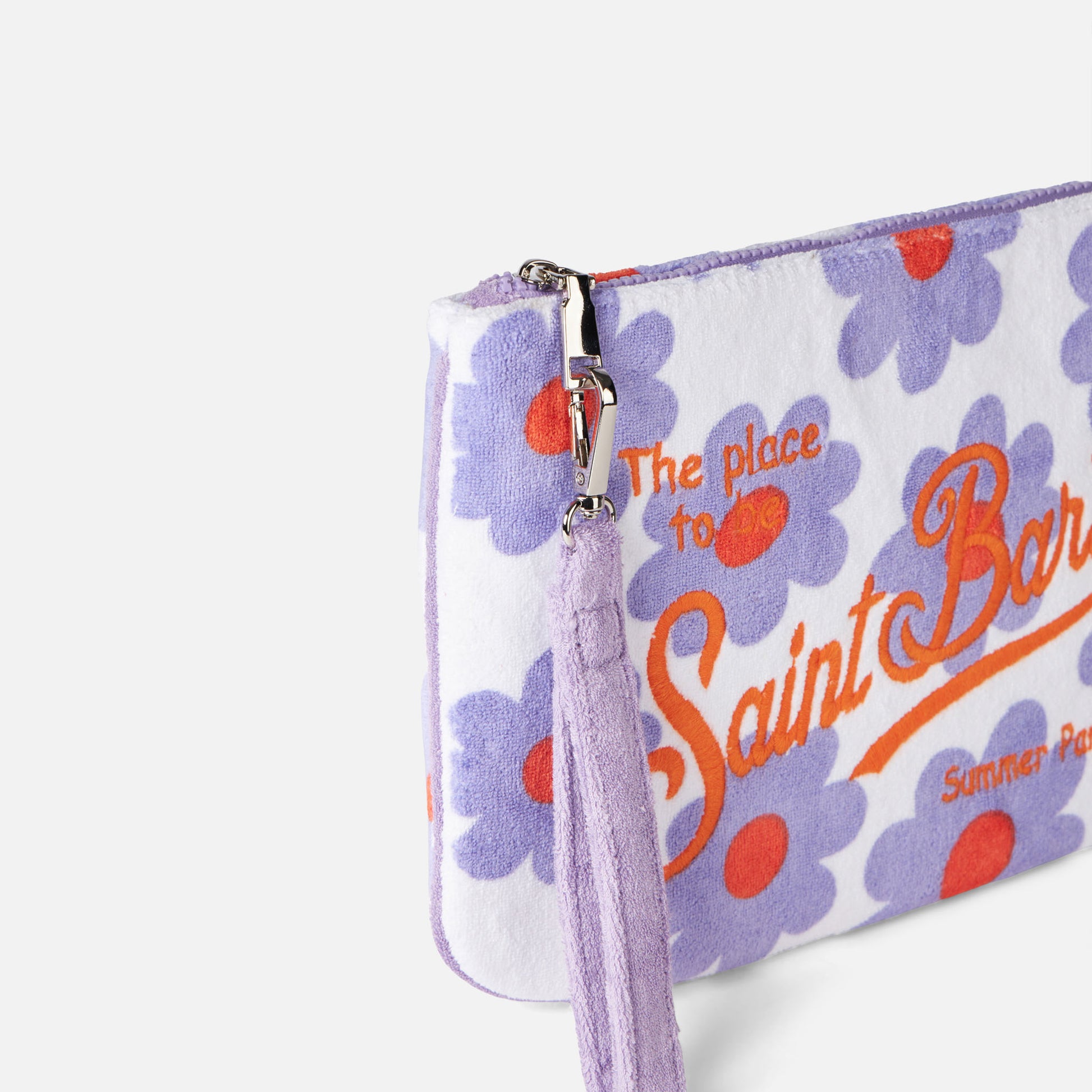 Parisienne-Clutch aus Frottee mit violettem und orangefarbenem Gänseblümchen-Print