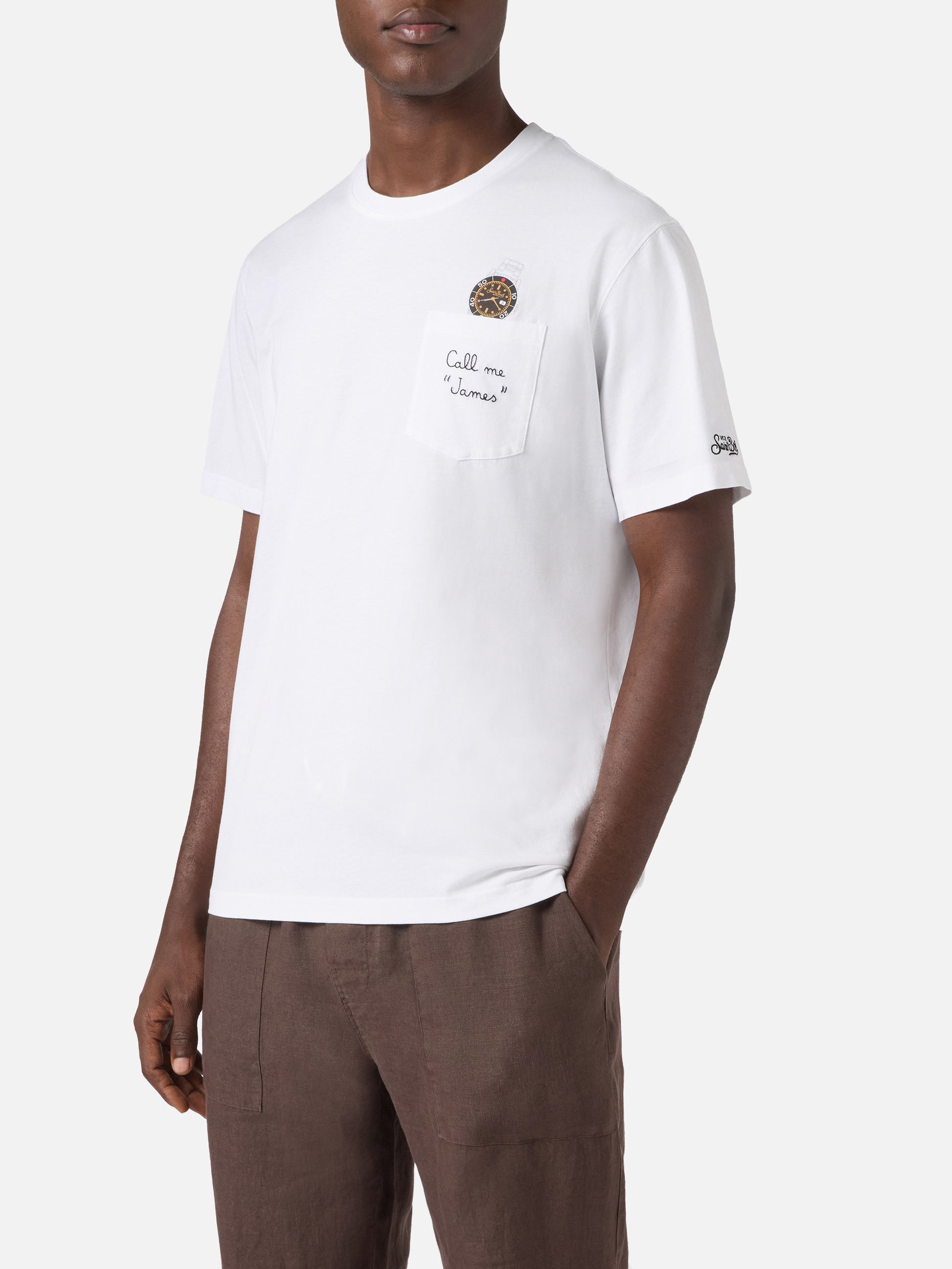 White Austin t-shirt with watch and Call Me James embroidery