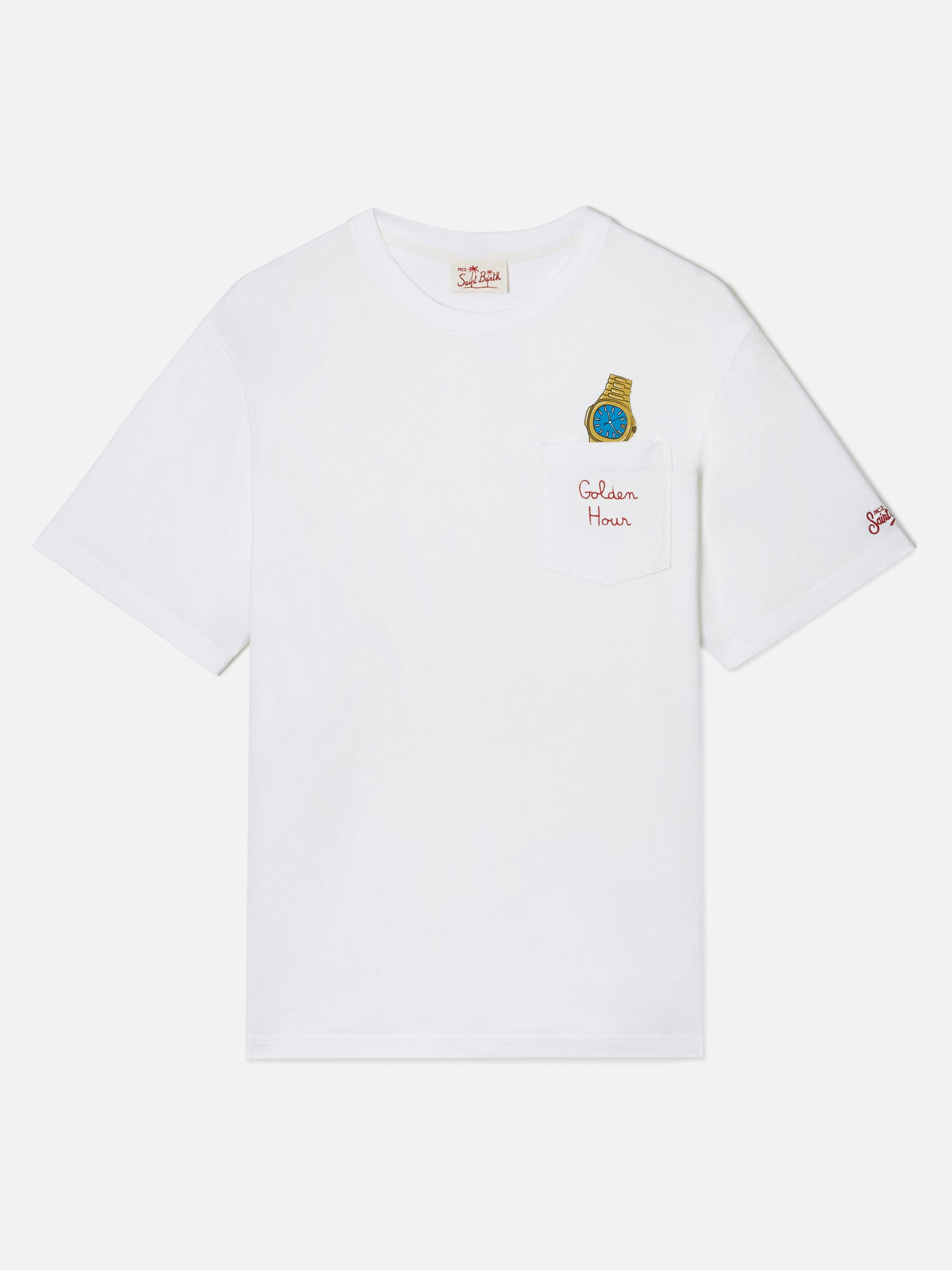 The Austin t-shirt is crafted from pure cotton, designed to provide comfort and a natural feel against the skin. The white solid-color design highlights the essential construction of the garment. The style features a chest pocket with contrasting Golden Hour embroidery and is completed by a watch illustration. The garment is finished with St. Barth embroidery. The model features a crew neck, short sleeves and a straight silhouette with regular fit.