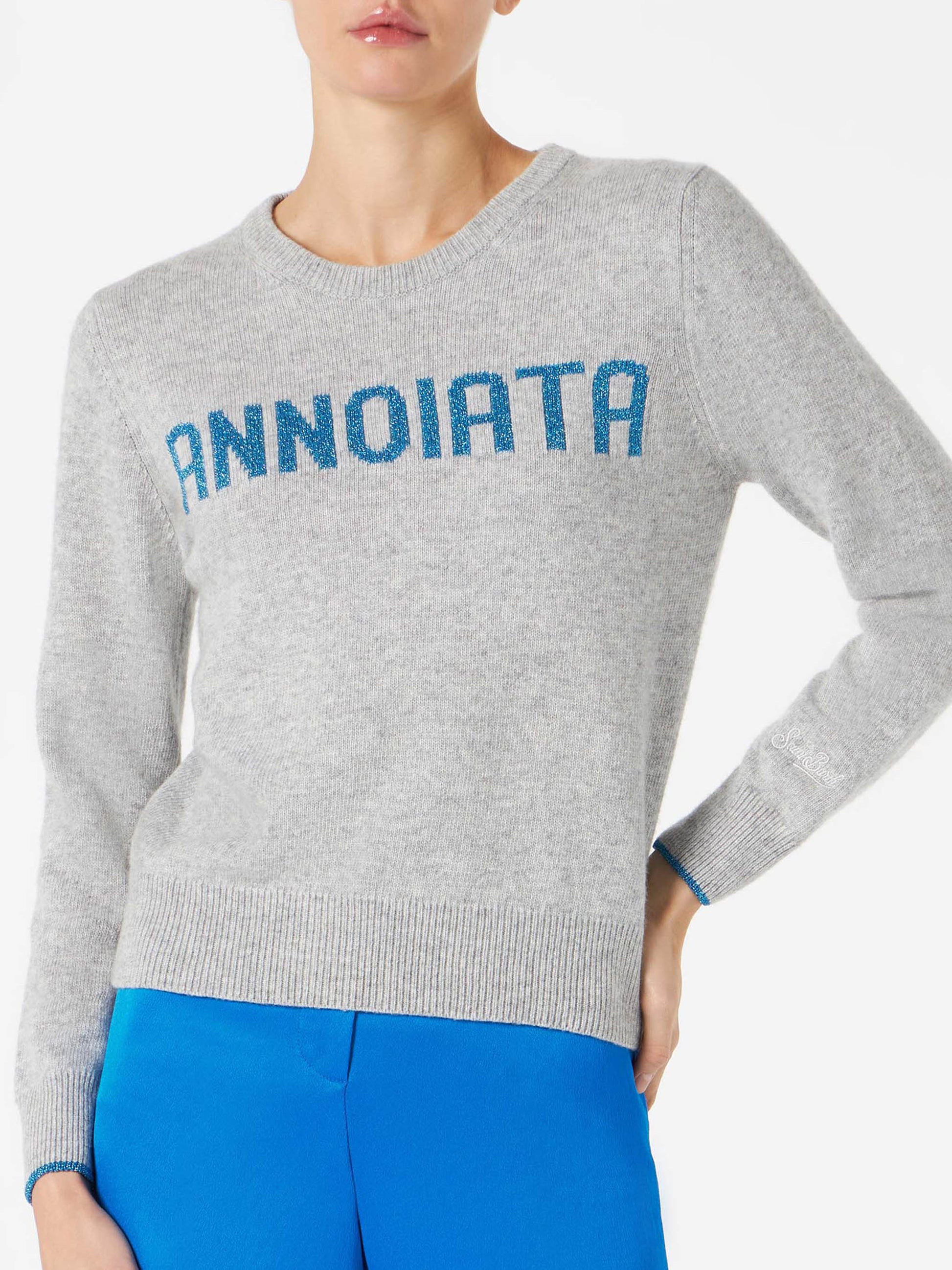 Grauer Damenpullover mit Annoiata-Lurex-Schriftzug