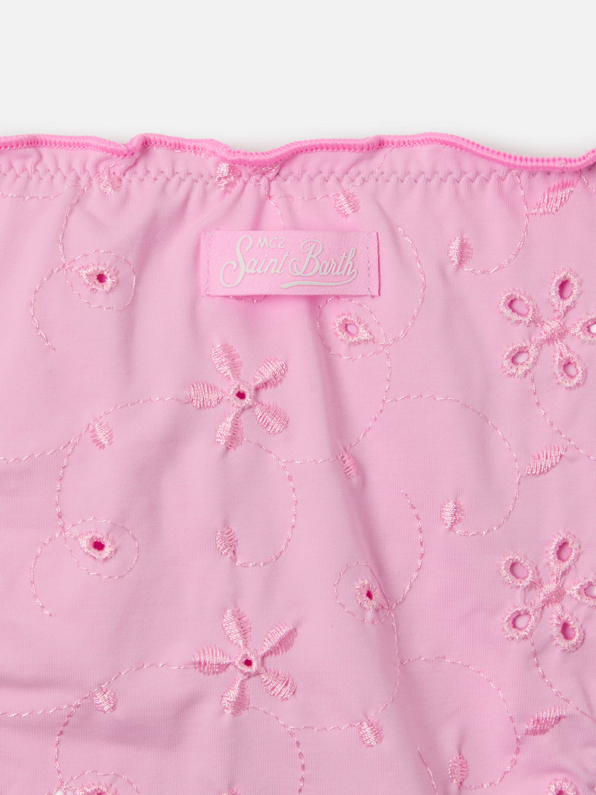 Bikini Cris in tessuto sangallo rosa con bordi arricciati
