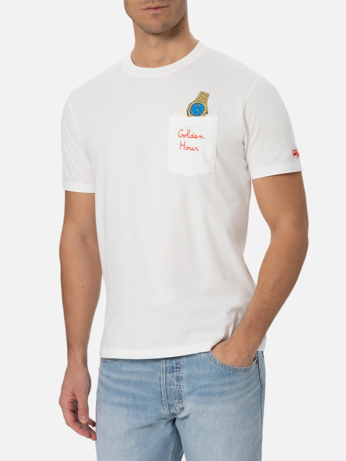 T-shirt da uomo in cotone bianco Connor con ricamo Golden hour