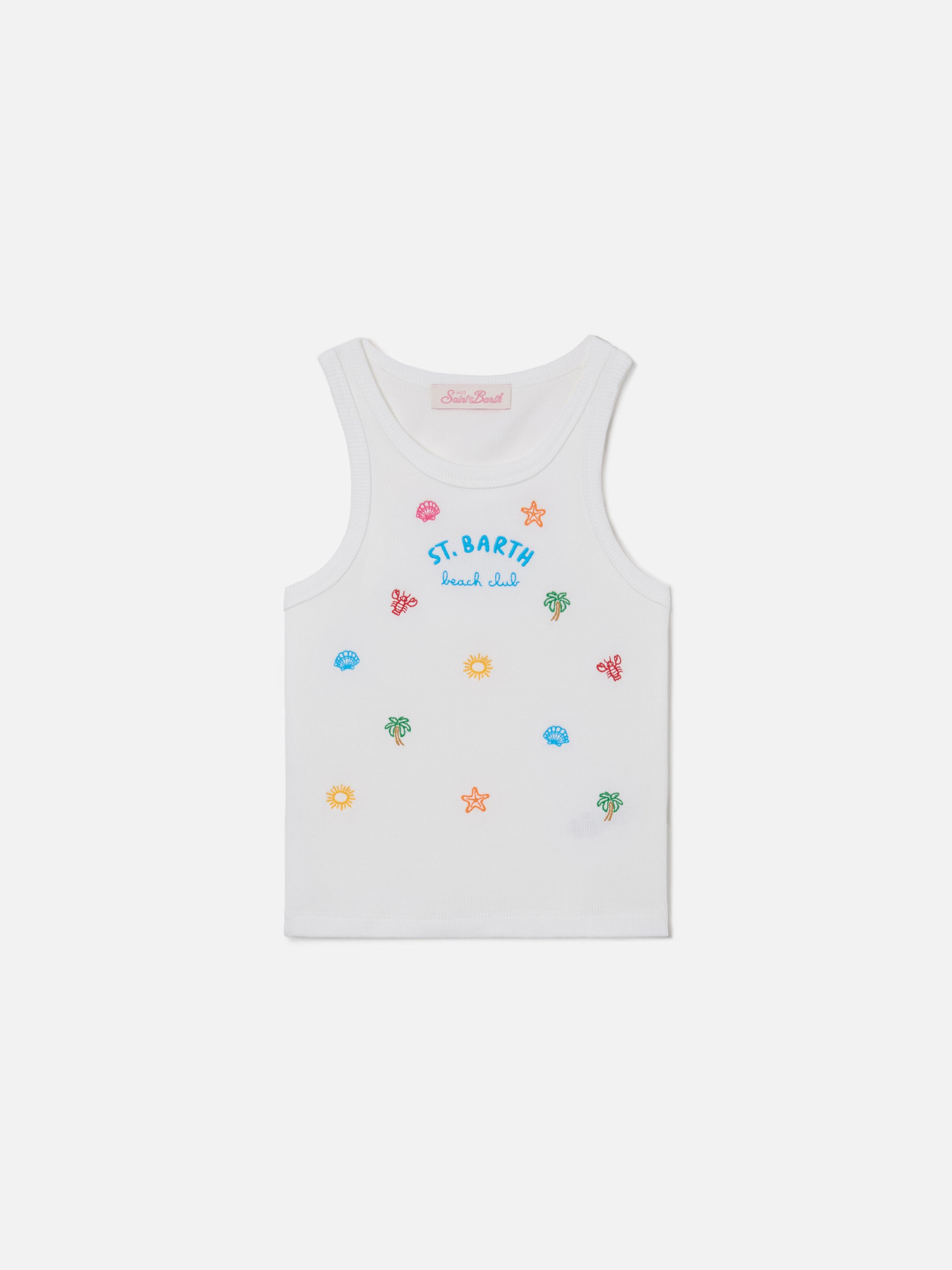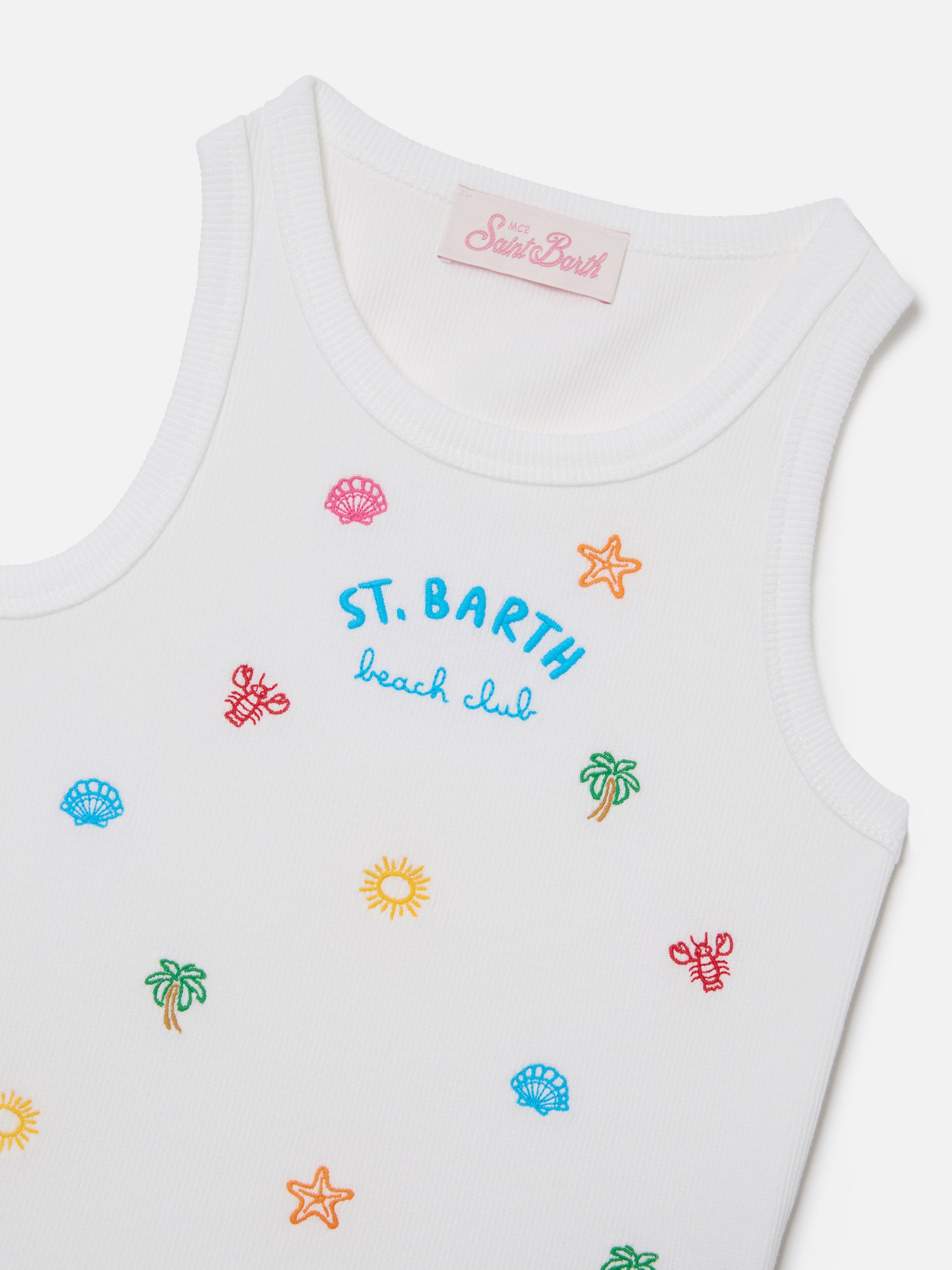 Blue Jr Tank-Top in white stretch cotton with multicolor embroidery