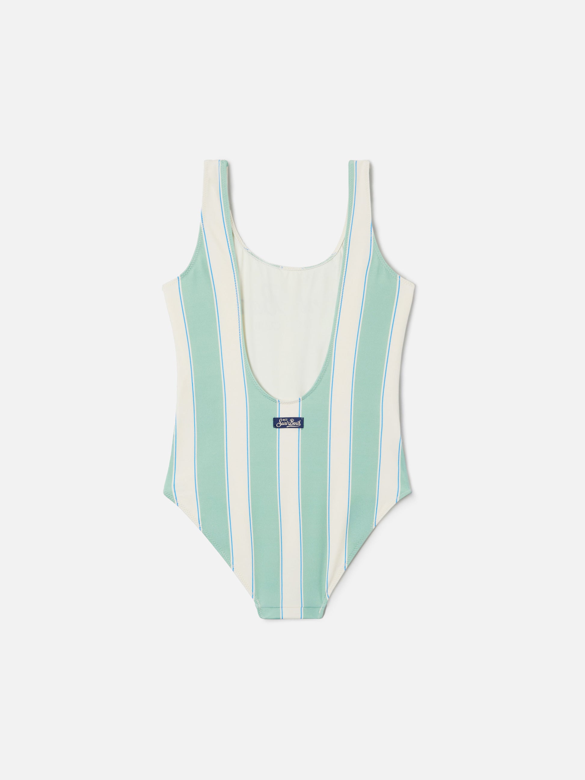 Cara green and white striped one-piece swimsuit with Beach Club print