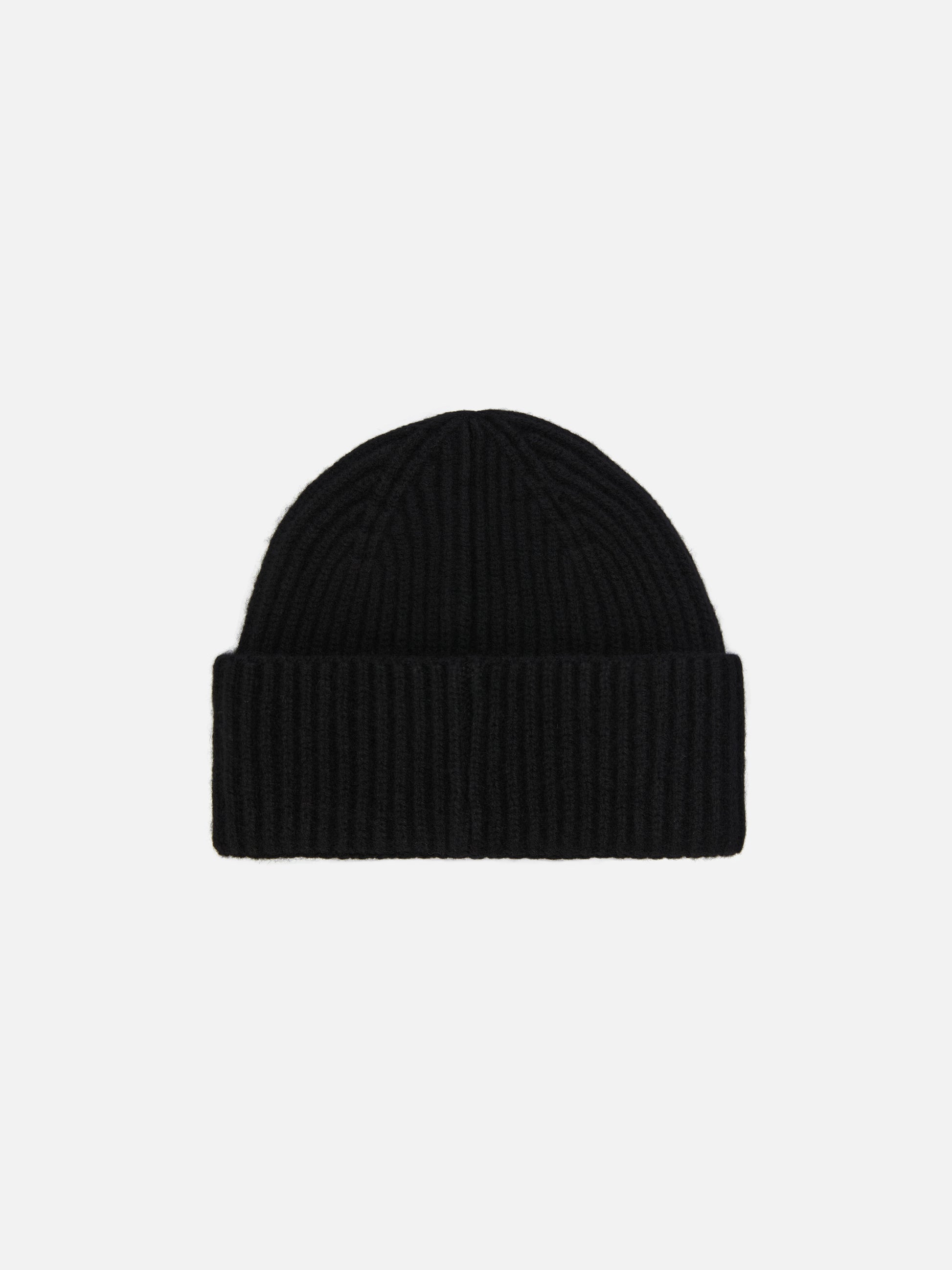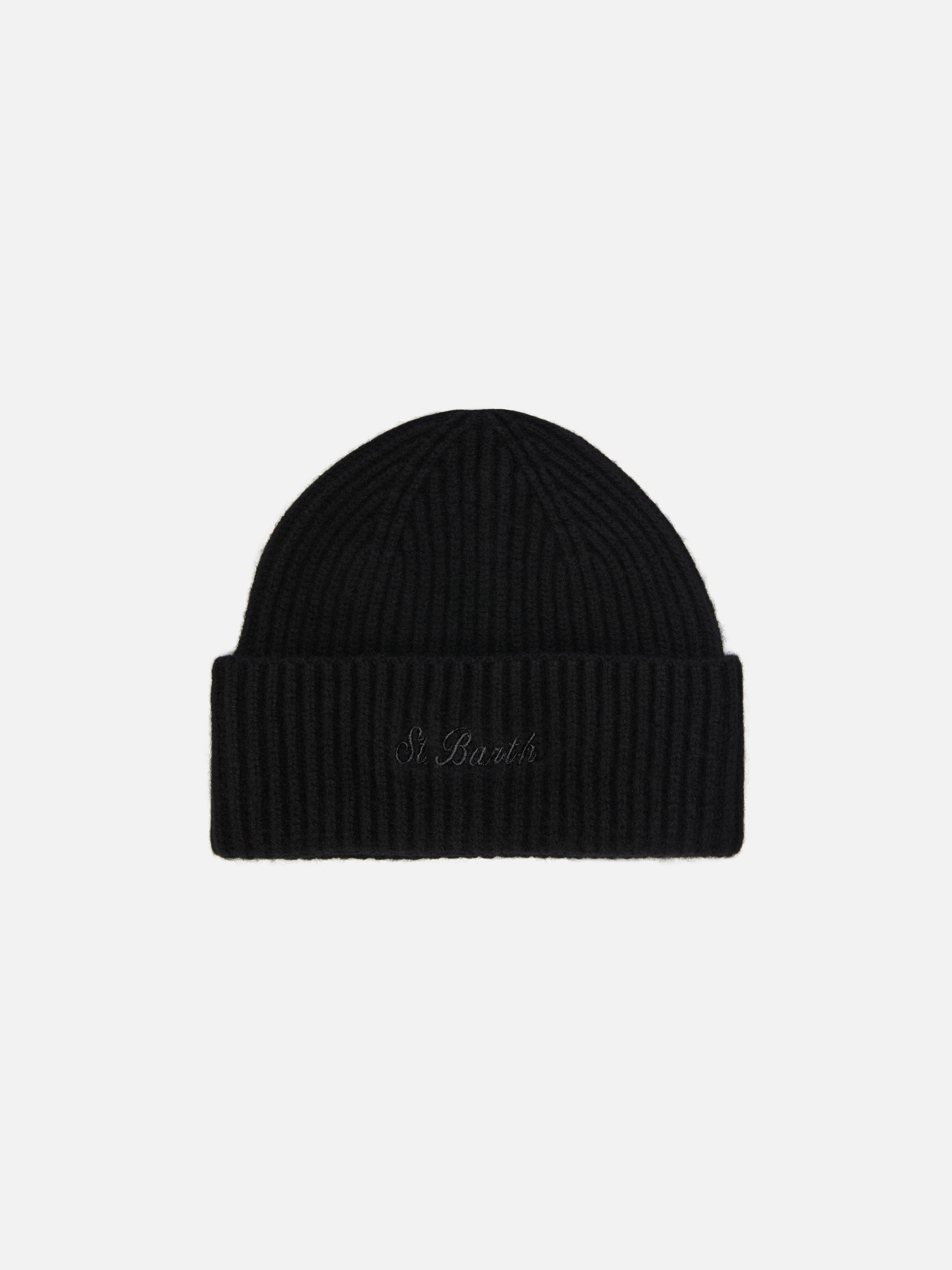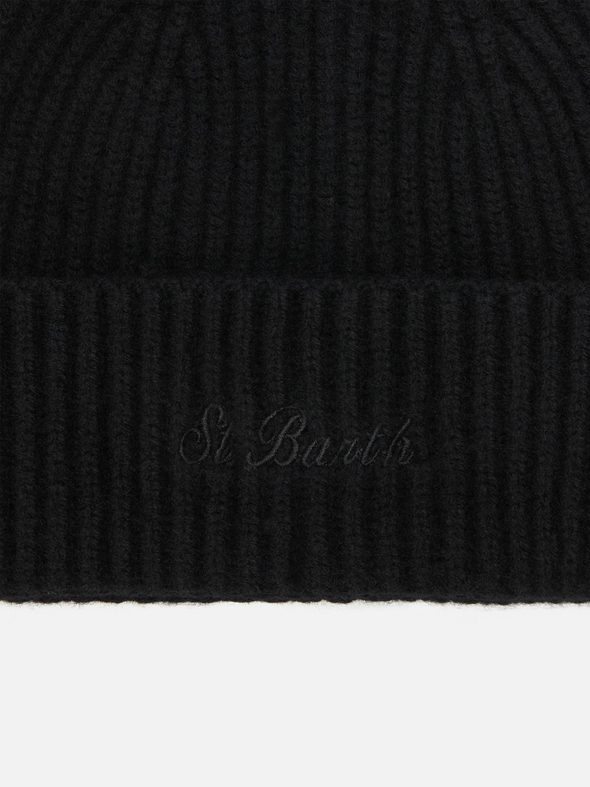 Moss Beanie in black ribbed knit with St. Barth embroidery