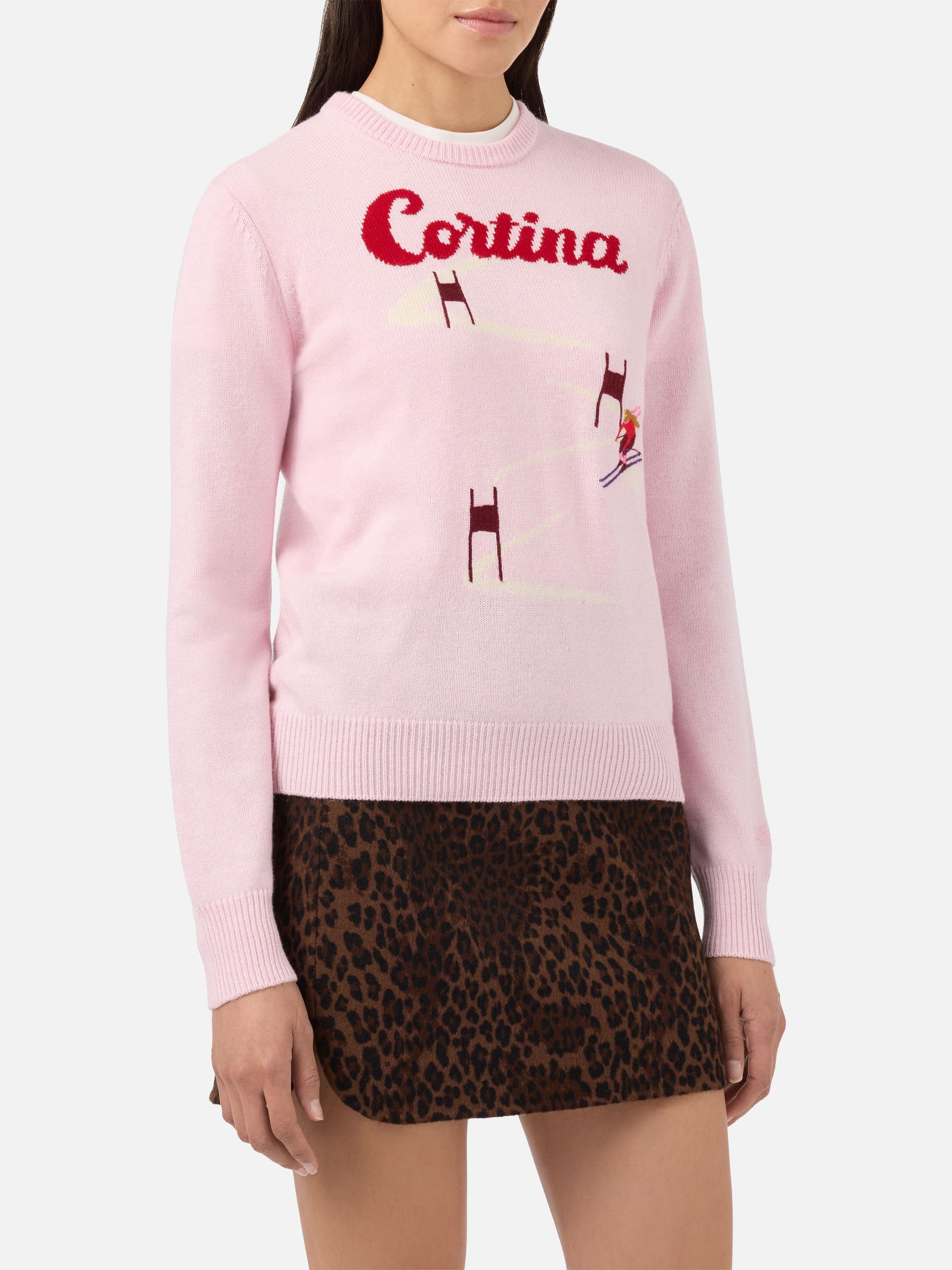 New Queen cashmere-blend sweater in pink with Cortina postcard jacquard