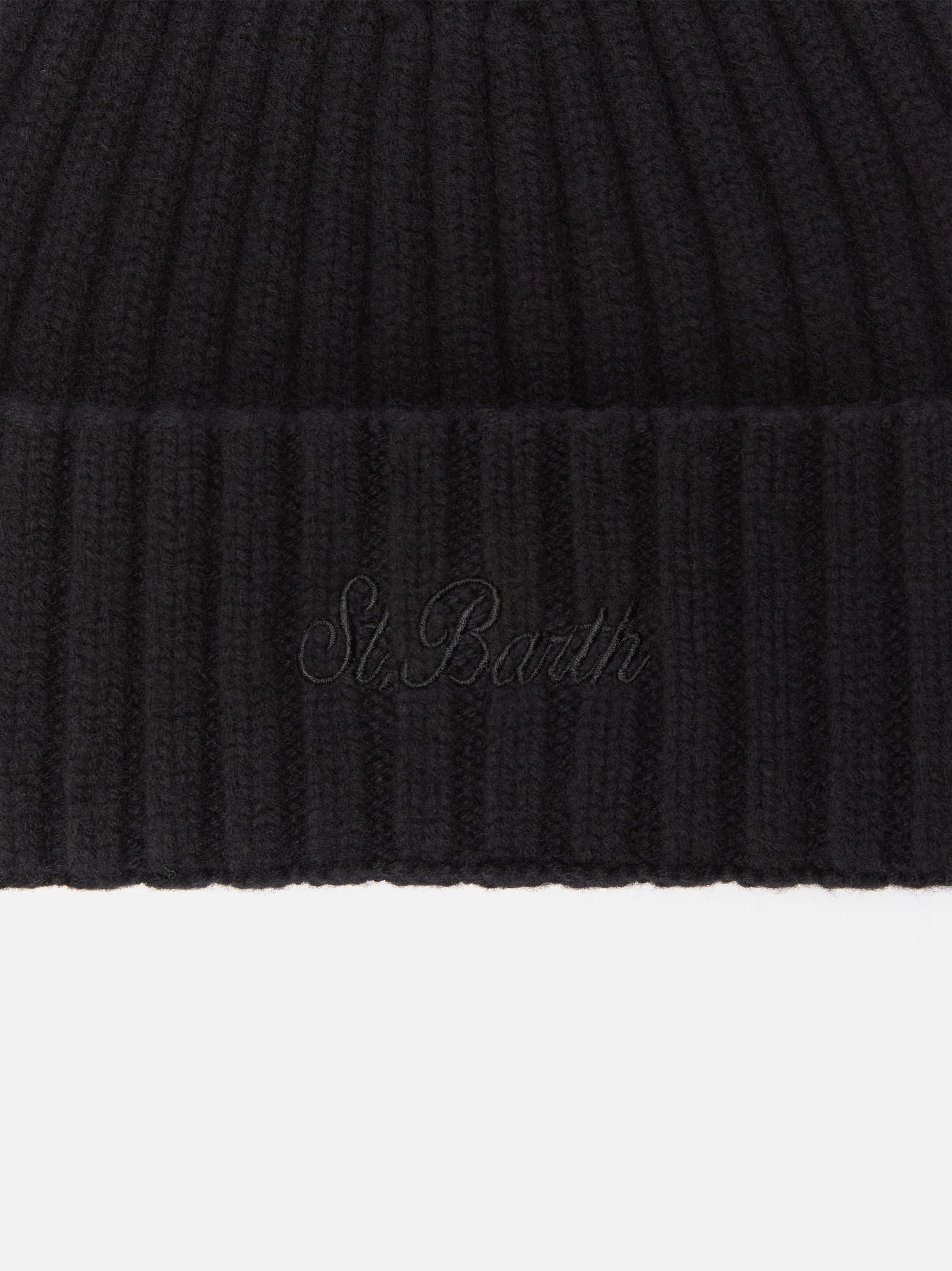 Wengen beanie in black wool with St. Barth embroidery on the turn-up