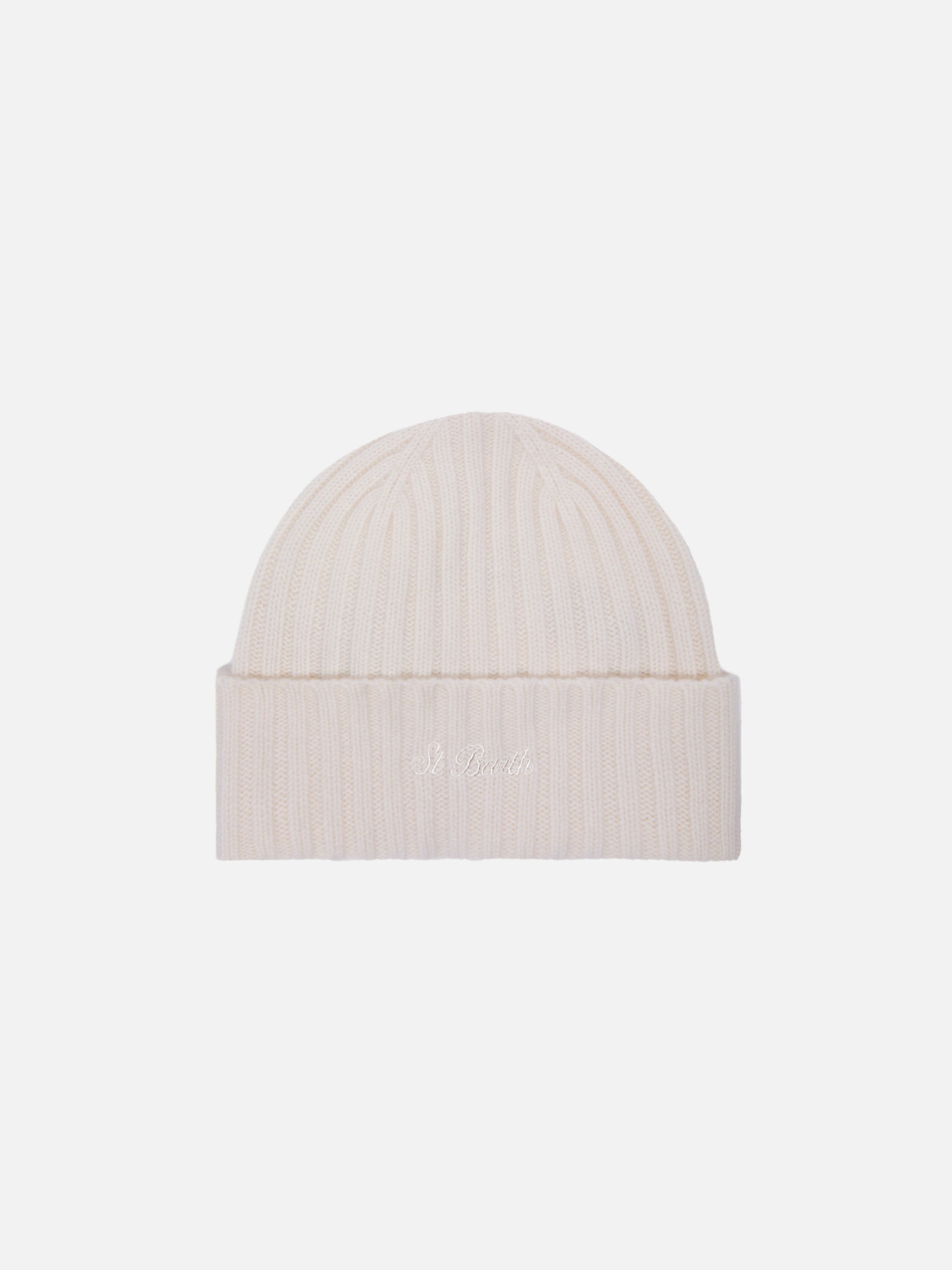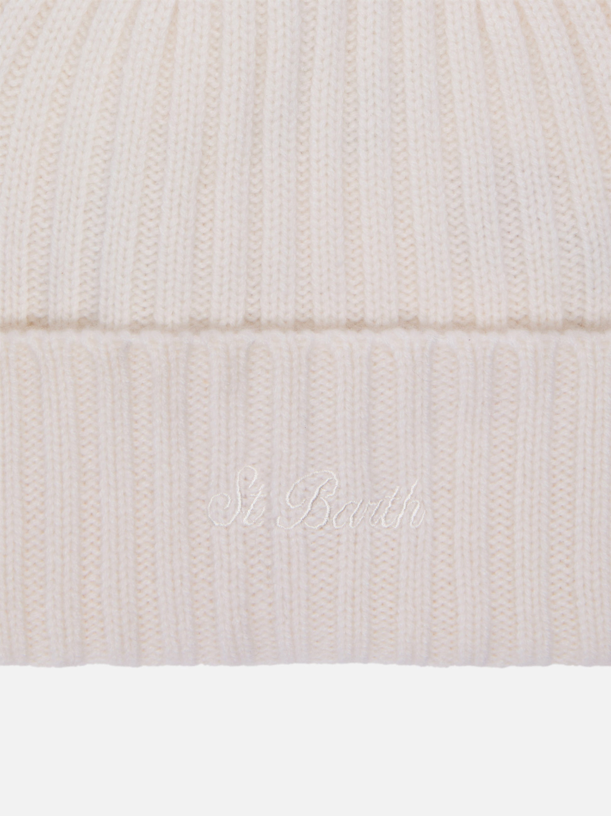 Wengen beanie in white cashmere with St. Barth embroidery on the turn-up